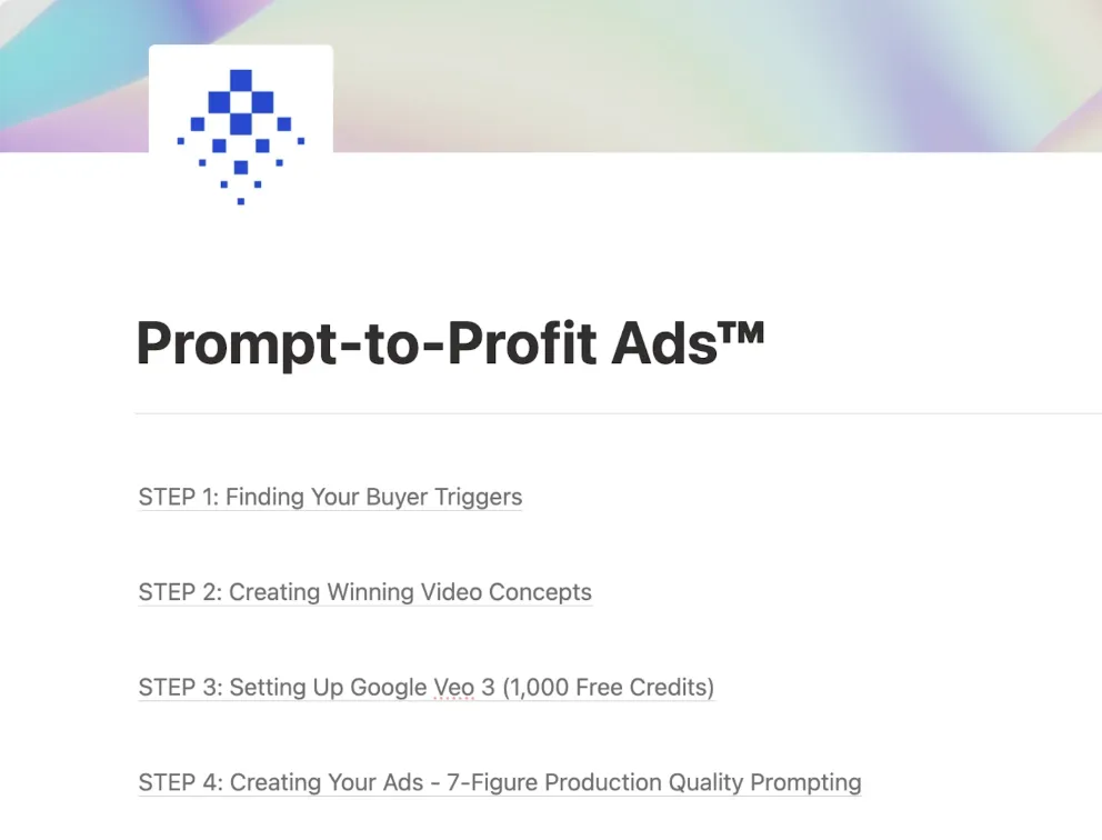 As soon as you check out, you’ll get an email with a direct link to the Prompt-to-Profit Ads™ System - hosted entirely in Notion (no logins, no platforms, no learning curve).